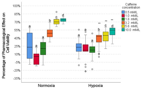 The effect of caffeine on cell viability under normoxic and hypoxic conditions. Intragroup comparisons (between concentrations under the same oxygen conditions) were analyzed using the Wilcoxon test; statistical significance is represented by different letters above the bars (p < 0.05). Intergroup comparisons (same concentration under normoxic vs. hypoxic conditions) were evaluated using the Mann–Whitney U test (** p < 0.01). The circles in the graph represent the outliers identified during the analysis. The exact p-values for each statistical comparison are provided in the Supplementary Materials (Tables S4–S6).