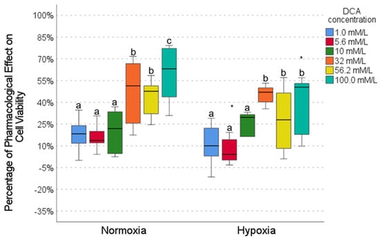 The effect of DCA on cell viability under normoxic and hypoxic conditions. Intragroup comparisons (between concentrations under the same oxygen conditions) were analyzed using the Wilcoxon test; statistical significance is represented by different letters above the bars (p < 0.05). Intergroup comparisons (same concentration under normoxic vs. hypoxic conditions) were evaluated using the Mann–Whitney U test (* p < 0.05). The circles in the graph represent outliers identified during the analysis. Exact p-values for each statistical comparison are provided in the Supplementary Materials (Tables S7–S9).