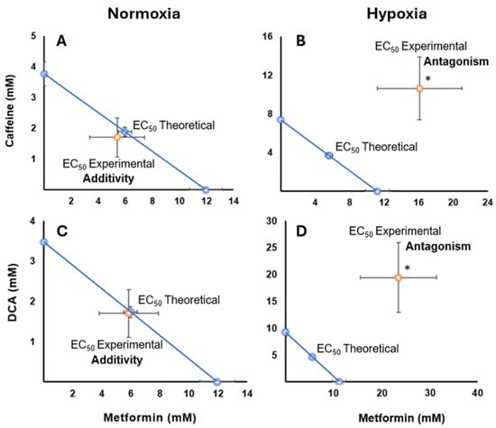 Isobolograms showing drug interactions in HCC827 cells under different oxygenation conditions. The diagonal blue line extending between the ordinate and abscissa axes connects the desired and effective concentration (EC50) of metformin with caffeine or DCA, representing the theoretical sum of the individual drug effects (the additivity line). (A) An additive effect is observed for the combination of metformin and caffeine in normoxia conditions, where the experimental points are located close to the additivity line. (B) The same combination in hypoxia shows an antagonistic effect, as evidenced by the deviation of the experimental point (orange) above the additivity line, indicating the need for higher concentrations to achieve the same effect. (C) The interaction between metformin and DCA in normoxia conditions presents an additive effect (p > 0.05), with the experimental points close to the theoretical line. (D) In contrast, the interaction between metformin and DCA in hypoxia exhibits a significant antagonistic effect (* p < 0.05), with the experimental points deviating away from the additivity line, suggesting a decreased combined effect compared to the sum of the individual effects.