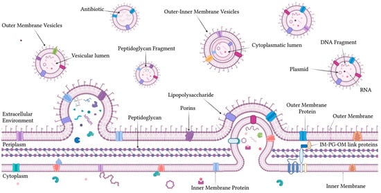 Bacterial EVs are nanoscale lipid structures actively secreted by Gram-negative and Gram-positive bacteria [1,2,3]. These vesicles are involved in intercellular transport and communication, loading biomolecules such as proteins, lipids, and nucleic acids into the vesicular lumen [4,5]. EVs fundamentally regulate diverse biological processes, including host–pathogen interaction, virulence, and microbial adaptation, promoting ecological success in complex environments [6,7,8]. The vesicle biogenesis and composition reflect the characteristics of the membrane and cell wall of each bacterial group [9,10]. In Gram-negative bacteria, an outer membrane (OM) forms OMVs [11,12]. These vesicles originate through the curvature of the OM and localized detachment, facilitated by factors such as the accumulation of lipids or asymmetric proteins [13,14].