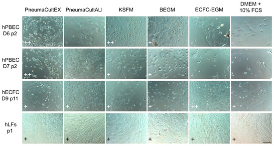 Figure 1. The effect of different media on cell morphology and proliferation. Bright field images of cultures of 2 independent hPBEC donors (D6, D7, p2), hECFCs (p11), and hLFs (p1) on day 3 of mono-culture in different hPBEC (PneumaCultEX, PneumaCultALI, KSFM, BEGM), endothelial (ECFC-EGM), and hLF (DMEM + 10% FBS) media. HPBECs were plated at a 1 × 104 cells/cm2 density, and hECFCs and hLFs at 5 × 103 cells/cm2 density. Scale bar = 80 µm. Scoring, indicated in the lower left corner, is defined as: ++ very good (high confluency, minimal cell patches, proper cell morphology), + good (medium confluency, some cell patches, decent cell morphology), and − bad (low confluency, many cell patches, bad cell morphology).