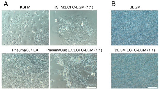 Figure 2. The expansion of hPBECs is better in epithelial-specific mediums. (A) Bright field images showing hPBECs (Donor 10, p3) in hPBEC growth media (KSFM or PneumaCultEX) or co-culture medium. Images were taken on day 4 of culture, and hPBECs were plated on cell culture plates at a density of 1 × 104 cells/cm2, N = 2. (B) Bright field images of hPBECs (Donor 6, p2) after 14 days at ALI. HPBECs were grown on insert membranes until confluency with BEGM and then air-exposed in either BEGM or co-culture medium BEGM:ECFC-EGM (1:1). Scale bar = 80 µm, N = 3.
