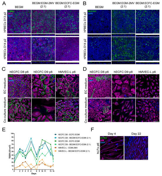 Figure 3. Testing co-culture media on mono-cultures of primary lung cells. (A,B) Confocal images showing differentiated hPBECs of two different donors (Donor 13 and 14, both p2). (A) ciliated cells (TUBIV, green), tight junctions (ZO-1, magenta) and nuclei (DAPI, blue), and (B) goblet cells (MUC5AC, green), and nuclei (DAPI, blue). XZ images are shown below the individual images to appreciate cell layer thickness. Scale bar = 100 µm, N= 3–5. (C,D) hECFC cells (Donor 8, p6; Donor 9, p8) or hMVEC-L (p6) in control or co-culture medium (BEGM:ECFC-EGM 2:1). (C) Endothelial cells expressed CD31 marker (green), VIM (magenta) and DAPI (blue), and (D) αSMA (green), VIM (magenta) and DAPI (blue) after 14 days on cell culture inserts. Scale bar = 100 µm, N = 3. (E) TEER values (Ω × cm2) for two hECFC donors (Donor 8 and 9) and hMVEC-L in either endothelial or co-culture medium. (F) Human lung fibroblasts in co-culture medium on day 4 and day 22 of culture stained against αSMA (green), VIM (magenta), and DAPI (blue). Scale bar = 50 µm.