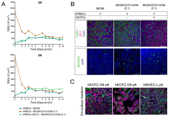 Figure 4. Testing co-culture medium for hPBECs-hMVECs co-cultures. (A) TEER values (Ω × cm2) of two hPBEC donors (Donor 8 and 9, both p2) mono-culture in BEGM (circle, blue line), hPBECs mono-culture in BEGM:ECFC-EGM (2:1) co-culture medium (square, brown line), and hPBECs-hECFC co-culture in co-culture medium (triangle, green line) measured on different days at ALI. (B) Differences in hPBECs differentiation between mono- and co-culture with hECFCs. BEGM and BEGM:ECFC-EGM (2:1) co-culture medium was used. Scale bar = 100 µm. (C) hECFC cells (Donor 8, p6; Donor 9, p8) or hMVEC-L (p6) as co-cultures with hPBECs in co-culture medium (BEGM:ECFC-EGM 2:1). Endothelial cells expressed CD31 marker (green), VIM (magenta), and DAPI (blue) after 14 days on cell culture inserts. Scale bar = 100 µm, N = 3.