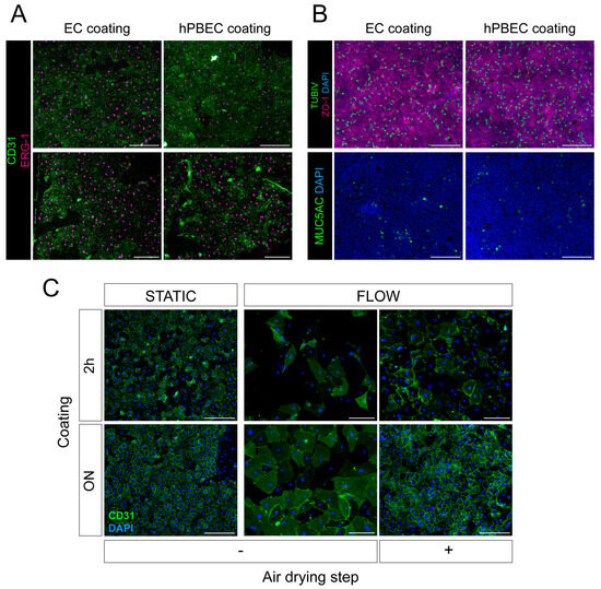Figure 5. Testing coating for endothelial cells plated on insert membranes. (A) Images of hMVEC (Donor 2, p6) in co-culture with hPBECs Donor 2 p3 using BEGM:EGM-2MV (2:1) medium. HMVECs were stained for endothelial markers CD31 (green) and ERG-1 (magenta). HPBECs and endothelial cell (EC) coatings were used (2 images/condition). Scale bar = 200 µm, N = 3. (B) Images of hPBECs from Figure 3B co-cultures. HPEBCs were stained for ciliated (TUBIV) and goblet (MUC5AC) cells, as well as tight junctions (ZO-1). The apical side of the inserts (hPBECs) was coated with hPBEC coating, and the basolateral side (hMVECs) was coated either with hPBEC coating or EC coating. Scale bar = 200 µm, N = 3. (C) Images of hMVEC Donor 16, p9 in EGM-2MV medium stained against CD31 (green) and DAPI (blue). hPBECs/co-culture coating condition was used in static (0 µL/min) or flow (200–400 µL/min) conditions in combination with or without the air-drying step. Scale bar = 200 µm, N = 2.