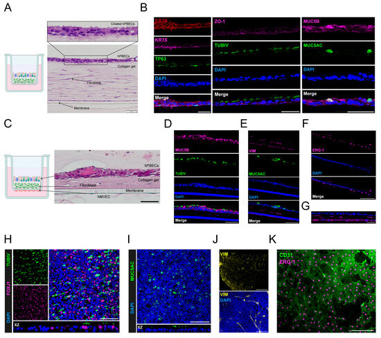 Figure 6. Development of a 3D human primary airway tri-culture model. (A) HE staining of a section of hPBECs and hLFs co-culture on an insert membrane after 14 days at ALI. Scale bar = 50 µm. On the left is a schematic illustration of the co-culture on a transwell insert: hLFs (green) were embedded in a collagen gel, and hPBECs were plated on top. (B) Staining of hPBECs grown on top of collagen gels in co-culture with hLFs. HPBECs expressed basal (TP63, KRT5, and KRT8), ciliated (TUBIV), and goblet cell markers (MUC5AC and MUC5B), and tight junctions (ZO-1) after 14 days at ALI. Scale bar = 50 µm. (C) HE staining of three-dimensional airway tri-culture after 14 days at ALI involving hPBECs, hLFs embedded in a collagen gel, and hMVECs plated on the basolateral side of the membrane (schematic illustration). Scale bar = 50 µm. (DG) Tri-cultures after 14 days at ALI. (D) Confocal images of hPBECs stained with differentiation markers TUBIV (cilia) and MUC5B (goblet cells). Scale bar = 200 µm. (E) Confocal images showing goblet cell marker MUC5AC, and fibroblast and endothelial cell marker Vimentin (VIM). Scale bar = 100 µm. (F) Confocal images of a staining of the endothelial nuclear marker ERG-1. Scale bar = 200 µm. (G) Staining of VIM (magenta) and DAPI (blue) showing hLFs in the collagen gel and hMVECs on the membrane. Scale bar = 50 µm. H–K) Whole mount staining of tri-culture. (H) hPBECs ciliated (TUBIV and FOXJ1) and (I) goblet cells (MUC5AC). Scale bar = 100 µm. (J) hLFs grown in collagen gels stained with VIM. Top scale bar = 1000 µm, bottom scale bar = 200 µm. (K) Endothelial cells are positive for CD31 (green) and ERG-1 (magenta). Scale bar = 200 µm. For all experiments, N = 3–5. All schematic illustrations were made using BioRender.com.