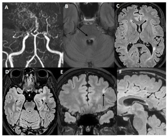 Case 1—Brain neuroimaging. (A) MR angiography: bilateral stenosis of the supraclinoid internal carotid arteries with multiple collateral moyamoya vessels. (B–F) Multiplanar FLAIR sequences depict multifocal demyelinating lesions (arrows): left pontine lesion (B), periventricular lesions (C,D), frontal juxtacortical lesion (E), intracallosal lesion (F).