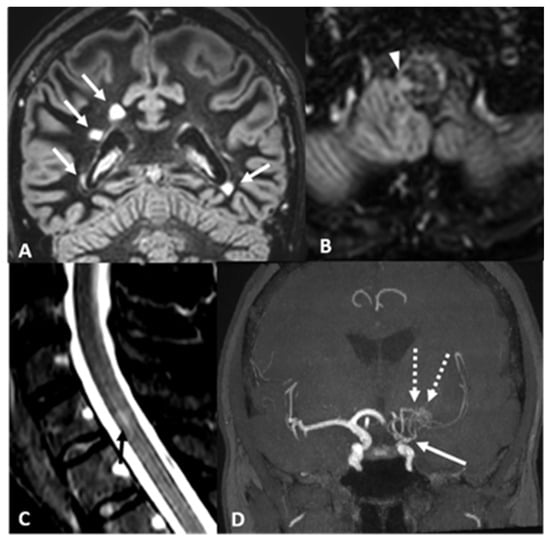 Case 2—Brain and spine imaging. (A) Coronal and (B) axial DIR sequences show multiple bilateral MS-typical periventricular lesions (arrows) perpendicular to the lateral ventricle walls, as well as a small lesion in the right part of the bulbo-medullary junction (arrowhead in (B)). (C) Sagittal MR STIR sequence of the cervical spine reveals a faint hyperintensity in the cervical cord (arrow). (D) TOF AngioMR, MIP reconstruction, confirms unilateral left MMA with ICA stenosis (arrow) and compensatory hypertrophy and hyperplasia of the lenticulostriate arteries (dotted arrows).