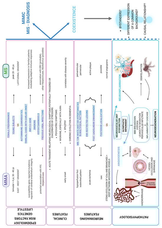 Due to these similarities and shared molecular basis, some authors hypothesized an interaction between MMA and MS, with MMA potentially triggering or accelerating demyelination processes, or MS putatively inducing a vasculitic phenomenon, finally leading to development of MMA [] (Figure 3).