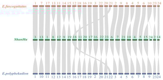 Collinearity comparison between the chromosomes of ShanHu, E. fuscoguttatus, and E. polyphekadion.