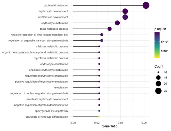 Based on the whole-genome information of the brown-marbled grouper, the camouflage grouper, and the hybrid ShanHu grouper, synteny analysis was conducted using MCscanX software (E-value ≤ 1 × 10−5, match size ≥ 5) with default parameters []. We identified the orthologous groups among these three species using all-to-all blast (E-value ≤ 1 × 10−5, identity ≥ 80%) and identified the expanded families using café []. Enrichment analyses based on GO annotations were performed to identify functional implications of the expanded family (Fisher’s exact test, adjusted p-value < 0.05). A PPI network was conducted using STRING v11.0 with default parameters []. Additionally, the maximal clique centrality (MCC) method of the cytoHubba module in Cytoscape (v3.10.3) software was performed to determine the hub genes in the networks [].