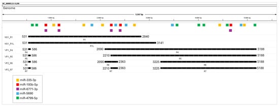 MicroRNAs are post-transcriptional regulatory noncoding RNAs involved in various biological processes such as cell differentiation, proliferation, and survival. They bind to complementary target messenger RNAs (mRNAs), leading to either translational inhibition or degradation []. miRNA-binding sites in viral genomes are primarily located in the non-translated regions (NTRs) but can also be found in the coding regions of viral proteins. There is a complex network of interactions between infected host cells and viruses in which miRNAs can play a crucial role, changing several biological processes, including antiviral defense [,]. Viral genomes and gene transcripts exploit passive mechanisms to deregulate host miRNA activity, such as mimicking or blocking the binding between a host miRNA and its target transcript, a phenomenon mediated by the miRNA seed site at the 5’ end of miRNA [].