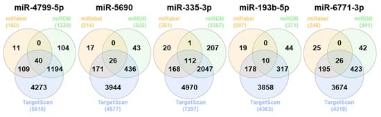 Venn diagrams indicate the number of common target genes for 193b-5p, miR-335-3p, miR-6771-3p, miR-5690, and miR-4799-5p in the three databases (miRabel—yellow, miRDB—green, and TargetScan—blue).