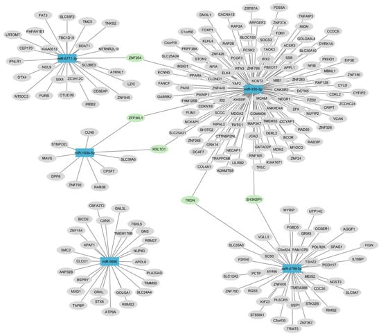 Network maps of 193b-5p, miR-335-3p, miR-6771-3p, miR-5690, and miR-4799-5p and their most common target genes constructed in Cytoscape software v.3.10.2. This analysis identified targets that were shared by two miRNAs. Colors: In blue, the miRNAs are identified; in green, target genes binding at least two miRNAs are identified; and in grey, the other genes are identified.