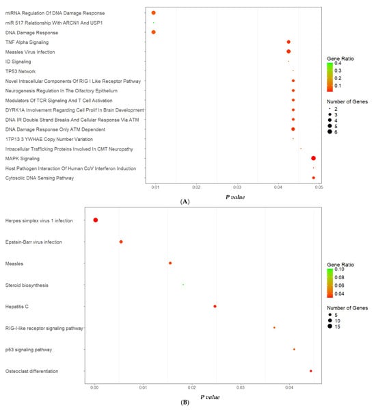 The pathways under the influence of all 214 target genes were identified by submitting to the enrichment analyses of EnrichR software, in which 269 and 176 common signaling pathways to all 214 genes were found by WikiPathways and KEGG databases, respectively. Of these, the pathways that presented statistical significance (p < 0.05) were selected: 18 from WikiPathways (Figure 5A) and 8 from KEGG (Figure 5B). From them, pathways were ranked according to low p-value and bubble size, simultaneously, as these suggest GO terms that are significantly enriched and involve a substantial number of genes. Larger bubbles signify a higher number of genes associated with a particular process or pathway. The cancer-related pathways were excluded (n = 6). Figure 5A illustrates the main WikiPathways enriched pathways: miRNA regulation of DNA damage response and DNA damage response. Another important enriched KEGG pathway, retrieved from EnrichR, was the Herpes simplex 1 virus pathway (Figure 5B).