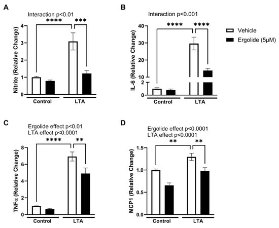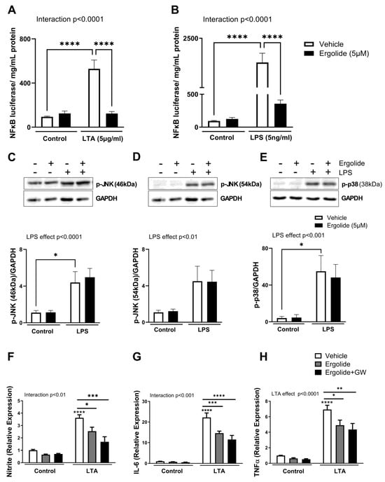 | LTA (Mean ± SEM) | LTA + Ergolide (Mean ± SEM) | p | LPS (Mean ± SEM) | LPS + Ergolide (Mean ± SEM) | p | |