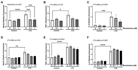 | Nitrite (µM) | 21.86 ± 3.89 | 9.80 ± 0.96 | * | 19.24 ± 1.32 | 11.54 ± 1.66 | *** |