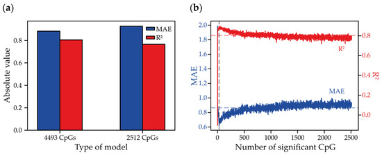 Predictive model efficiency depending on the number of CpG sites used. (a) MAE (blue) and R2 (red) for two models: 4493 passage-correlated CpGs and 2512 significant CpGs. (b) The change in R2 and MAE depending on the number of selected significant CpG sites. The gray vertical dashed line indicates the number of CpG sites at which the best MAE and R2 values were achieved (N = 28). The blue and red dashed horizontal lines indicate the average MAE and R2 values for all the models (0.865 and 0.803, respectively).