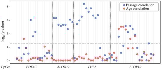 To select target CpGs, we made a shortlist of ten candidate loci that were previously used for MSC passage number prediction (ALOX12, DOK6, LTC4S, FPGT-TNNI3K) or demonstrating age-dependent DNA methylation dynamics in various cell types (ASPA, EDARADD, ELOVL2, FHL2, PDE4C, PENK) (Table S4) [25,26,27,38,41,42,43]. After that, we filtered out the loci that did not meet the following criteria: (1) the genomic locus should contain CpGs whose DNA methylation level correlates with the duration of MSC culture in the generated BS-seq data; (2) the locus should contain stretches of at least five CpGs in the 150 bp region to allow for the calculation of DNA methylation heterogeneity scores and make the analysis affordable and effective by using 2 × 75 paired-end sequencing. Eventually, genomic regions in the vicinity of the ALOX12, ELOVL2, FHL2, and PDE4C genes met these criteria and, therefore, were used further (Figure S3).