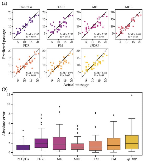 To assess the dynamics of DNA methylation heterogeneity in the four genomic regions used to build a BS-seq-based predictive model, we calculated the heterogeneity metrics for all of the encompassed CpGs. Next, we selected CpGs (FDRP, qFDRP) or CpG-blocks (MHL, PDR, PM, ME), demonstrating the strongest Spearman’s rank correlation with the cell passage numbers and used them as predictors to build RFR models (Tables S6–S11, Figure 3). The MHL-based model demonstrated the lowest MAE of 1.461 passages and the best coefficient of determination: R2 = 0.828. The models based on PDR and PM metrics performed weaker, with MAE = 1.726, R2 = 0.694, and MAE = 1.973, R2 = 0.66, respectively. The other metrics, such as FDRP (MAE = 2.252, R2 = 0.616), ME (MAE = 2.232, R2 = 0.565), and qFDPR (MAE = 2.412, R2 = 0.499) demonstrated the worst performance among the others. Therefore, in our case, the application of heterogeneity metric scores alone did not outperform the usage of the average DNA methylation levels of individual CpGs for building models to predict MSC passage. In general, WSH-based models tended to produce more outliers and exhibited lower R2 values (Figure 3a), consistent with our previous findings [31], where average DNA methylation-based models demonstrated better convergence compared to WSH-based approaches. Unlike average DNA methylation, which relies on individual CpG states, WSH metrics assess combinatorial DNA methylation patterns across overlapping sequencing reads, suggesting that the increased variability in WSH-based predictions may reflect sample-specific differences in methylation patterns that do not significantly influence mean methylation levels at individual CpGs. While further experiments are still required to elucidate the underlying causes of the higher experimental variation in WSH scores, we next sought to explore whether integrating heterogeneity metrics with mean methylation could enhance passage prediction accuracy.