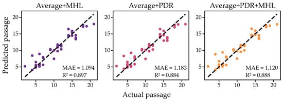 Each combined dataset was used to build RFR-based models using LOOCV. The hybrid model combined data on the average DNA methylation, and MHL metrics performed the best, with MAE = 1.094 passages and R2 = 0.897 (Figure 4). Hybrid models combining average DNA methylation with PDR or MHL and PDR demonstrated a weaker performance, with MAE = 1.183, R2 = 0.884, and MAE = 1.120, R2 = 0.888, respectively. However, all of the combined models outperformed those that were solely based on DNA methylation heterogeneity metrics or average DNA methylation levels (Figure 3a and Figure 4). Therefore, we observed an improvement in the performance of the BS-seq-based cultural age prediction models when combining the analysis of average DNA methylation and heterogeneity metrics (Table 1).
