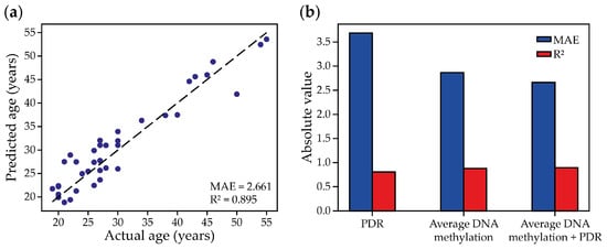 The performance of the chronological age prediction models (a) using average DNA methylation values and the PDR scores as predictors and (b) a comparison of the performance of models utilizing various DNA methylation-based predictors.