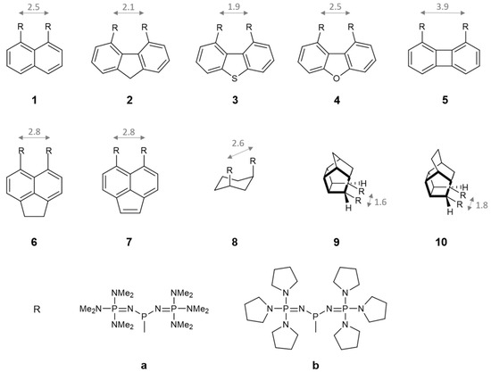 The proton-chelating effect in phosphine proton sponges has also been studied, although to a limited extent. In a study by Reiter et al. [23] experimental investigations of 1,8-di(phosphinyl)naphthalene revealed that P+–H···P hydrogen bonding is insignificant in this class of compounds. This conclusion was based on the crystal structures of the target compounds, though basicity was not specifically examined. However, it should be emphasized here that the interatomic distance imposed by the 1,8- substitution on naphthalene, which is 2.5 Å, is almost ideal for the formation of N+–H···N intramolecular hydrogen bonds [24], while, due to the substantially larger size of the phosphorus atom, this distance is too small for the formation of an optimal P+–H···P bond [25]. In a study by Haav et al. [26], pKa measurements in acetonitrile solution were performed on several diphosphines, and it was concluded that there might be a weak intramolecular hydrogen bond in protonated diphosphines with an aromatic backbone and there is no intramolecular hydrogen bond in protonated diphosphines with an alkyl backbone. Since intramolecular hydrogen bonding is one of the two key factors in the proton-chelating effect, its potential absence suggests that the PCE in phosphine proton sponges could be small or negligible, particularly when compared to nitrogen-based proton sponges.