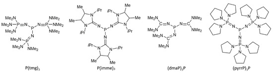 - Schwesinger, R.; Schlemper, H. Peralkylated Polyaminophosphazenes—Extremely Strong, Neutral Nitrogen Bases. Angew. Chem. Int. Ed. Engl. 1987, 26, 1167–1169. [Google Scholar] [CrossRef]