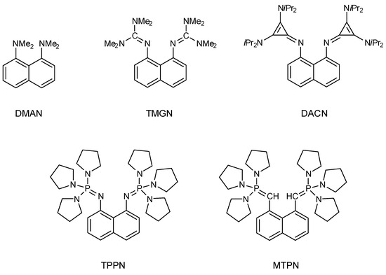 In the design of new organic superbases, one of the factors contributing to their enhanced basicity is the proton-chelating effect (PCE) [13,14]. This effect was first observed in the DMAN molecule [14] and involves two primary mechanisms for basicity strengthening: the diminishing of electron-pair repulsion upon protonation and the formation of an intramolecular hydrogen bond in the conjugate acid. The proton-chelating effect has since been effectively utilized to further enhance the inherently high basicity of compounds such as guanidines [15,16], cyclopropenimines [17,18] and phosphazenes [13,19,20]. All these compounds are referred to as ‘proton sponges’ because of their structural similarity to the DMAN molecule. Some examples are presented in Scheme 2.