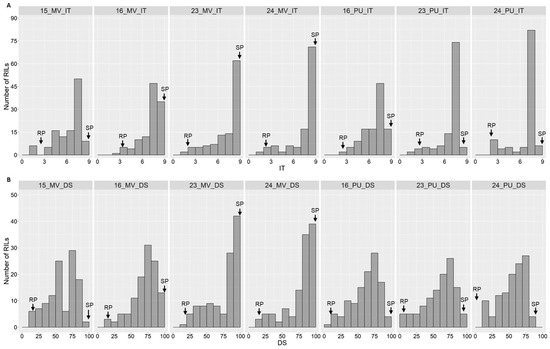 Histograms showing the distributions of stripe rust phenotypes of the recombinant inbred lines (RILs) from cross AvS/WS tested in seven field environments: (A) infection type (IT); (B) disease severity (DS). The parents and RILs were evaluated for stripe rust responses in Mount Vernon (MV) in 2015, 2016, 2023, and 2024; and in Pullman (PU) in 2016, 2023, and 2024. RP = resistant parent (William Som, PI 184597); SP = susceptible parent (AvS).