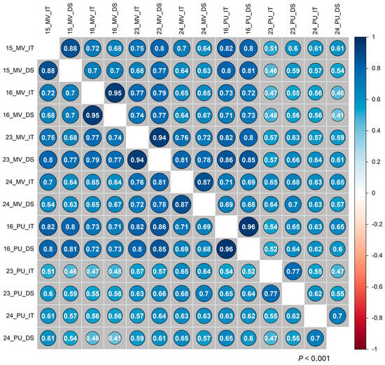 Correlation coefficients between stripe rust phenotypes across seven field environments. The numbers inside the circles are Spearman correlation coefficients, significant at p < 0.001; 15 = 2015, 16 = 2016, 23 = 2023, 24 = 2024. MV = Mount Vernon; Pu = Pullman, WA. IT = infection type; DS = disease severity.