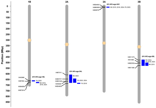 The first QTL, QYrWS.wgp-1BL, was located on the long arm of chromosome 1B, within the 669 to 682 Mb interval based on the IWGSC RefSeq v2.1, and explained 10% to 19% of the phenotypic variation. The LOD scores for this QTL ranged from 4.5 in Pullman 2023 to 7.4 in Mount Vernon 2024. This QTL was consistently detected across four environments, including Mount Vernon 2015, Mount Vernon 2016, Mount Vernon 2024, and Pullman 2023. The SNP markers flanking this QTL were IWA3998 and IWB7694 to the left (proximal) and IWB40850 and IWB72918 to the right (distal).