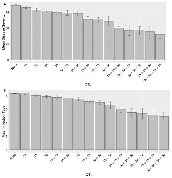 A similar trend was observed for the IT data, with higher levels of resistance associated with the increase in the number of QTL (Figure 5B). Any individual QTL, except 2A and 3A, and all types of QTL combinations resulted in statistically (p < 0.05) lower mean IT scores than the group lacking any of the four resistance QTL.