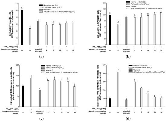 Protective effect of 40% ethanolic P. multiflorum (EPM) extracts in PM2.5-induced cytotoxicity in A549 and RPMI2650 cells. (a,b) Cell viability. (c,d) Intracellular reactive oxygen species (ROS) contents. The data were expressed as mean ± SD (n = 3). A one-way analysis of variance (ANOVA) test with Duncan’s multiple range tests was conducted. Distinct lowercase letters on the bar graph denote significant differences among groups (p < 0.05).