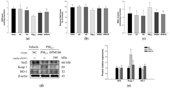 Malondialdehyde (MDA) contents were reported to increase in the PM2.5 group (1.63 nmole/mg of protein) compared with the NC group (1.13 nmole/mg of protein) (Figure 3c). However, the MDA contents were decreased in the EPM group (EPM50, 1.32 nmole/mg of protein; EPM100, 1.20 nmole/mg of protein) compared with the PM2.5 group. There were no significant differences in the Sham group (1.24 nmole/mg of protein), the NS group (1.09 nmole/mg of protein), and the NC group.