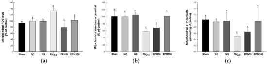 Mitochondrial ATP contents decreased in the PM2.5 group (0.51 nmole/mg of protein) compared with the NC group (0.98 nmole/mg of protein) (Figure 4c). However, the mitochondrial ATP contents increased in the EPM group (EPM50, 0.65 nmole/mg of protein; EPM100, 1.00 nmole/mg of protein) compared with the PM2.5 group. There were no significant differences in the Sham group (1.05 nmole/mg of protein), the NS group (1.00 nmole/mg of protein), and the NC group.