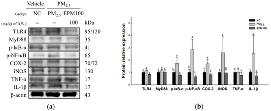 To evaluate the protective effect of EPM on PM2.5-induced inflammation, the expression levels of proteins related to the TLR4 signaling pathway (TLR4, MyD88, p-IκB-α, p-NF-κB, COX-2, iNOS, TNF-α, and IL-1β) (Figure 5) were measured. As a result, the expression increased in the PM2.5 group (1.15, 1.14, 1.73, 1.42, 1.70, 2.60, 1.37, and 4.74) compared to the NC group (1.00). In addition, the expression decreased in the EPM100 group (0.84, 1.01, 0.79, 0.74, 0.82, 0.97, 1.00, and 0.96) compared to the PM2.5 group.