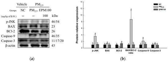 Effect of 40% ethanolic P. multiflorum (EPM) extracts on apoptosis in PM2.5-induced mice. (a) Western blot band images. (b) Relative expression levels of phospho-c-Jun N-terminal kinases (p-JNK), BCl-2-associated X (BAX), B-cell lymphoma 2 (BCl-2), BAX/BCl-2 ratio, caspase-9, and caspase-3 were quantified based on β-actin. The data were expressed as mean ± SD (n = 3). A one-way analysis of variance (ANOVA) test with Duncan’s multiple range tests was conducted. Distinct lowercase letters on the bar graph denote significant differences among groups (p < 0.05).