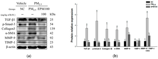 Effect of 40% ethanolic P. multiflorum (EPM) extracts on pulmonary fibrosis in PM2.5-induced mice. (a) Western blot band images. (b) Relative expression levels of transforming growth factor beta 1 (TGF-β1), phospho-suppressor of mothers against decapentaplegic-3 (p-Smad-3), Collagen III, alpha-smooth muscle actin (α-SMA), metalloproteinase-9 (MMP-9), tissue inhibitor of matrix metalloproteinase-1 (TIMP-1), and the MMP-9/TIMP-1 ratio were quantified based on β-actin. The data were expressed as mean ± SD (n = 3). A one-way analysis of variance (ANOVA) test with Duncan’s multiple range tests was conducted. Distinct lowercase letters on the bar graph denote significant differences among groups (p < 0.05).