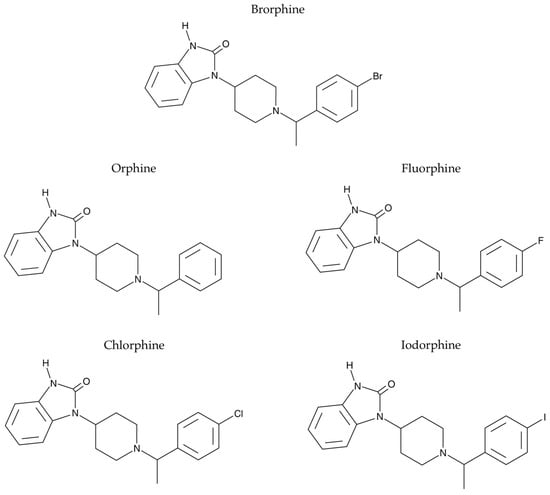 Chemical structure of Brorphine and its analogues Orphine, Fluorphine, Chlorphine, and Iodorphine.