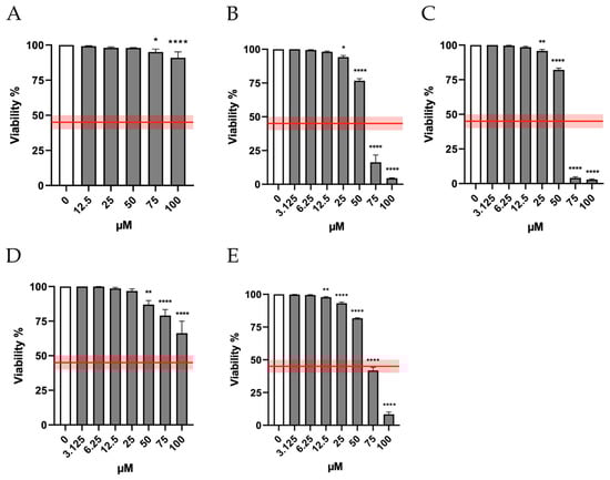 Viability of TK6 cells after 26 h treatment with (A) ORF, (B) Br-ORF, (C) I-ORF, (D) F-ORF and (E) Cl-ORF at the concentrations reported compared to the untreated negative control (0 µM). Each bar represents the mean ± SEM of at least three independent experiments. Data were analyzed by Repeated Measures ANOVA—(A) F (5, 19) = 8.494; p = 0.0002; (B) F (8, 19) = 685.7; p < 0.0001; (C) F (8, 18) = 2003; p < 0.0001; (D) F (8, 24) = 27.78; p < 0.0001; (E) F (9, 20) = 2318; p < 0.0001—followed by Dunnett post-test. The red line indicates the OECD threshold for cell viability. * p < 0.05 vs. 0 µM; ** p < 0.01 vs. 0 µM; **** p < 0.0001 vs. 0 µM.