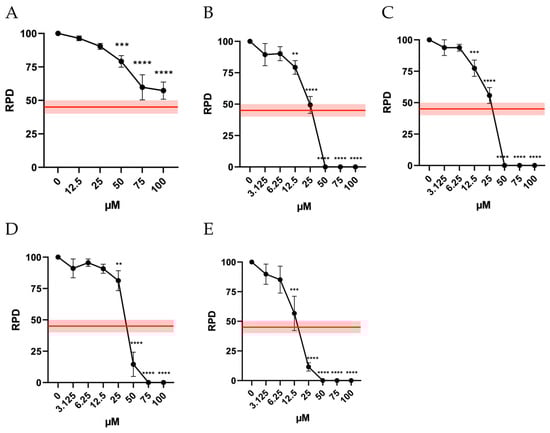 RPD of TK6 cells after 26 h treatment with (A) ORF, (B) Br-ORF, (C) I-ORF, (D) F-ORF, and (E) Cl-ORF at the concentrations reported compared to the untreated negative control (0 µM). Each value represents the mean ± SEM of at least three independent experiments. Data were analyzed by Repeated Measures ANOVA—(A) F (5, 19) = 24.78; p < 0.0001; (B) F (8, 18) = 52.13; p < 0.0001; (C) F (8, 18) = 52.52; p < 0.0001; (D) F (8, 18) = 43.34; p < 0.0001; (E) F (9, 20) = 12.79; p < 0.0001—followed by Dunnett post-test. The red line indicates the OECD threshold for cell replication. ** p < 0.01 vs. (0 µM); *** p < 0.001 vs. (0 µM); **** p < 0.0001 vs. (0 µM).