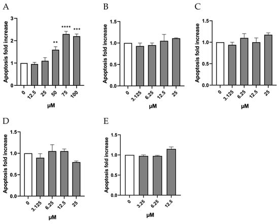 Apoptosis fold increase of TK6 cells after 26 h treatment with (A) ORF, (B) Br-ORF, (C) I-ORF, (D) F-ORF and (E) Cl-ORF at the concentrations reported compared to the untreated negative control (0 µM). Each value represents the mean ± SEM of at least three independent experiments. Data were analyzed by Repeated Measures ANOVA—(A) F (5, 7) = 40.64; p < 0.0001; (B) F (4, 4) = 0.7246; p = 0.6187; (C) F (4, 4) = 1.494; p = 0.3535; (D) F (4, 4) = 2.453; p = 0.2030; (E) F (3, 3) = 16.04; p = 0.0237—followed by Bonferroni or Dunnett post-tests. ** p < 0.01 vs. (0 µM); *** p < 0.001 vs. (0 µM); **** p < 0.0001 vs. (0 µM).
