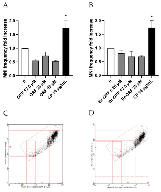MNi frequency fold increase on TK6 cells after 3 h treatment in the presence of S9 mix with (A) ORF or (B) Br-ORF at the concentrations reported compared to the untreated negative control (0 µM) and positive control (CP). Each value represents the mean ± SEM of at least three independent experiments. Data were analyzed by Repeated Measures ANOVA—(A) F (4, 4) = 11.94; p = 0.0170; (B) F (4, 4) = 9.590; p = 0.0251—followed by Dunnett post-tests. * p < 0.05 vs. (0 µM). Representative FCM dot plots of nuclei and MNi scored in (C) a negative control and (D) in 50 µM ORF-treated cells.