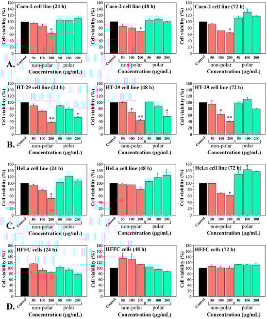 Cytotoxicity of Tolypothrix tenuis PACC 5497 extracts on adenocarcinoma Caco-2 cells (A), HT-29 cells (B), HeLa cells (C) and normal human fibroblasts HFFC (D). Cell viability was measured using MTT assays after treatment with increasing concentrations of extracts (50, 100, and 200 µg/mL) for 24, 48 and 72 h. Results are expressed as mean ± SD of three independent experiments, each performed in triplicate. Statistical significance was defined by the Mann–Whitney U test versus the control. * p < 0.05, ** p < 0.01.