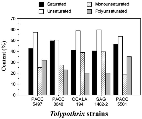 The content of SFAs ranged from 40.4% to 49.8%, while the unsaturated fatty acids ranged from 50.2% to 59.6%. These results are close to those reported by De Oliveira et al. [35], where the SFA content was approximately 36% and the MUFA content was 50% for the cyanobacterium Tolypothrix sp. CACIAM 22. The total PUFA content was similar in Tolypothrix distorta CCALA 194, Tolypothrix distorta SAG 1482-2, and Tolypothrix tenuis PACC 8648, ranging from 19.9% to 22.8%. Tolypothrix sp. PACC 5501 and Tolypothrix tenuis PACC 5497 had PUFA contents from close to 32.0% to 35.2%.