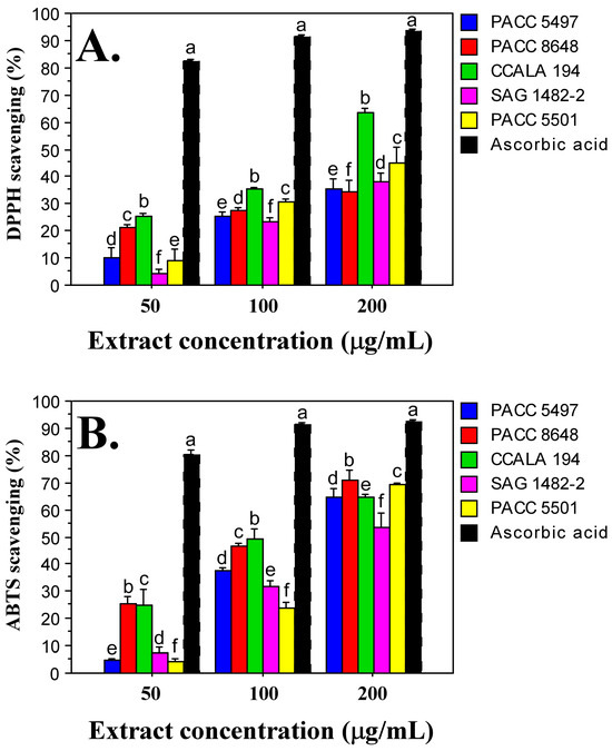 Antioxidant activity of Tolypothrix extracts. DPPH scavenging (A) and ABTS scavenging (B) at different concentrations (50, 100, and 200 µg/mL) of non-polar extracts from the Tolypothrix strains. Values are expressed as mean ± SD of three replicates. Letters show a significant difference (p < 0.05) according to Duncan’s test. Ascorbic acid was used as a positive control.