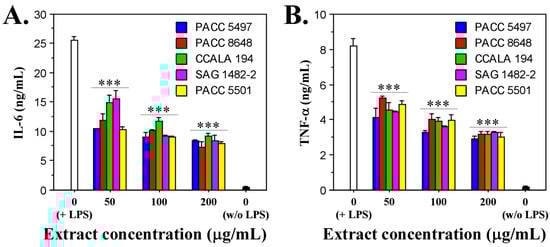 In vitro effects of Tolypothrix extracts on LPS-stimulated murine macrophages (RAW264.7 cells). Levels of secreted IL-6 (A) and TNF-α (B) in the cell culture medium after treatment of the LPS-stimulated cells with increasing concentrations of extracts (50, 100, and 200 µg/mL) for 24 h. The asterisks indicate statistical significance (*** p < 0.001) from the positive control (non-treated LPS-stimulated cells) as determined by the Kruskal–Wallis test.