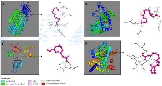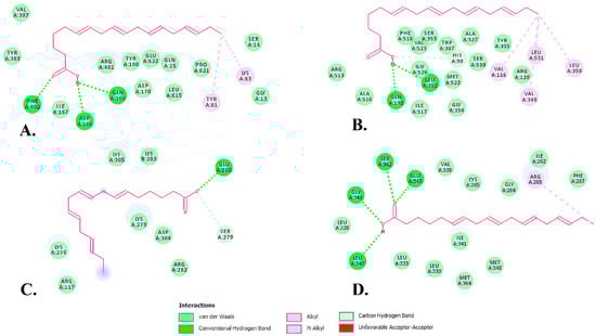Two-dimensional (2D) structures of SDA-protein complexes representing binding affinity of SDA—ALOX5 (A), SDA—COX-2 (B), SDA—NF-κB (C), and SDA—PPAR-γ (D).