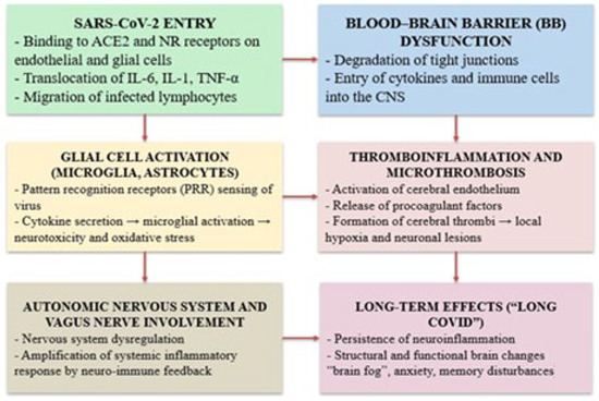 This diagram illustrates the main biological mechanisms involved in the development of cognitive and neuropsychiatric symptoms after SARS-CoV-2 infection. The virus enters through the angiotensin-converting enzyme 2 (ACE2) and neuropilin-1 (NRP1) receptors on endothelial and glial cells, triggering a series of events, including the systemic release of cytokines such as interleukin-6 (IL-6), interleukin-1 beta (IL-1β), and tumor necrosis factor alpha (TNF-α) and the infiltration of immune cells into the central nervous system (CNS). These processes promote disruption of the blood–brain barrier (BBB), activation of glial cells (microglia and astrocytes), and thromboinflammatory responses, including cerebral microthrombosis. The resulting pathophysiological changes lead to neuroinflammation, oxidative stress, and neuronal injury. In parallel, dysregulation of the autonomic nervous system (ANS) and the vagus nerve exacerbates inflammation through neuroimmune feedback. Together, these mechanisms contribute to the long-term sequelae of Long COVID, including persistent neuroinflammation, cognitive dysfunction (“brain fog”), anxiety, and memory impairment [51,53,54,55,56].